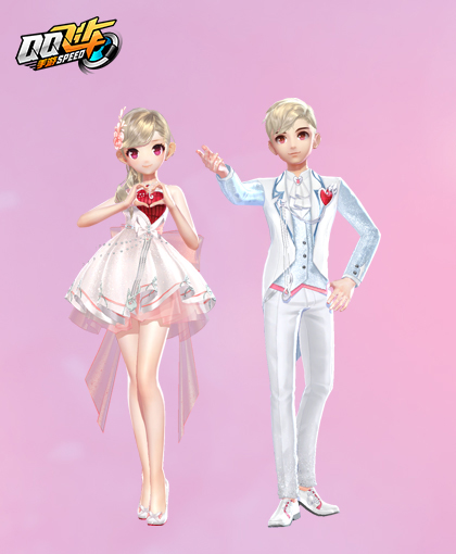 这套专为约会打造的甜蜜礼服,仿佛是童话故事中公主与王子的专属。女生的套装是白色的抹胸蓬蓬裙,丝质的礼服之下是一层粉色轻纱,轻柔梦幻,印证了恋爱中的少女的美好心情。男生的套装是纯白色的复古礼服,以红心胸针作为点缀,衬托出男生的英俊不凡和风度翩翩。