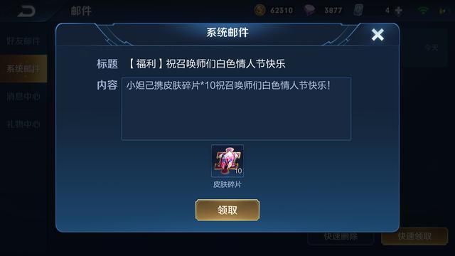 王者荣耀官方在3月14日正式发放情人节最后的补偿福利,这份福利涉及到全体玩家,每位玩家只要登录游戏,就能领取5个恩爱暴击+10个皮肤碎片,这应该有史以来最豪华的一次全员补偿。